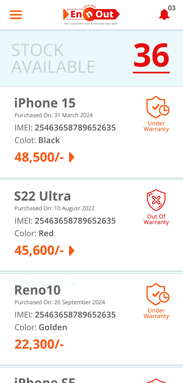 En-n-Out a sale & purchase data store mobile app simplifies transaction tracking for businesses, providing a quick and efficient way to record sales and purchases on the go. It allows dealers to log items, prices, quantities, dates, and transaction details, with valid photo id like adhaar card and DL etc and the good part is that Pruchase & sale agreement auto generated by this app.
